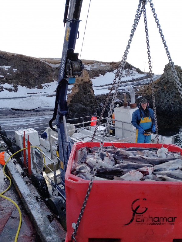 The customer which bought these cranes is the fishing company EINHAMAR SEAFOOD, and cranes are dowloading boxes full of seafood from the fishing vessels